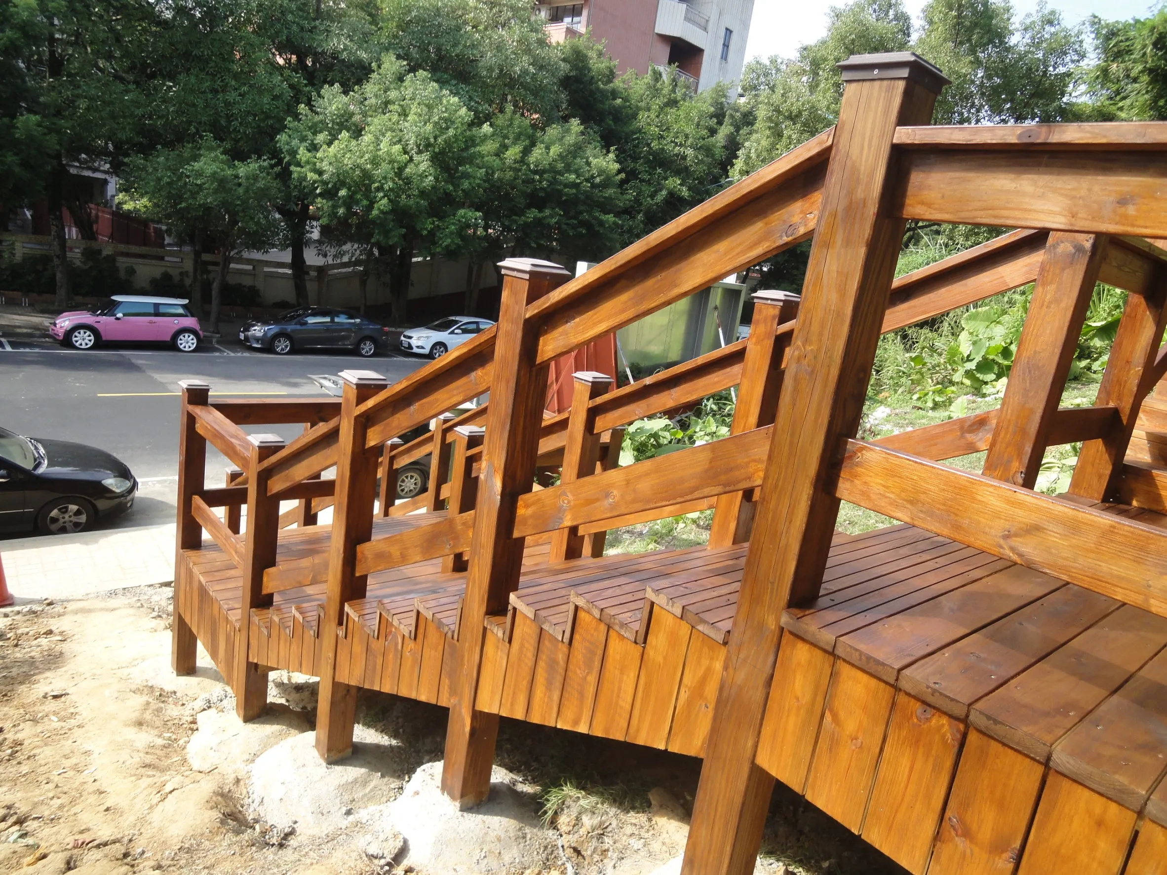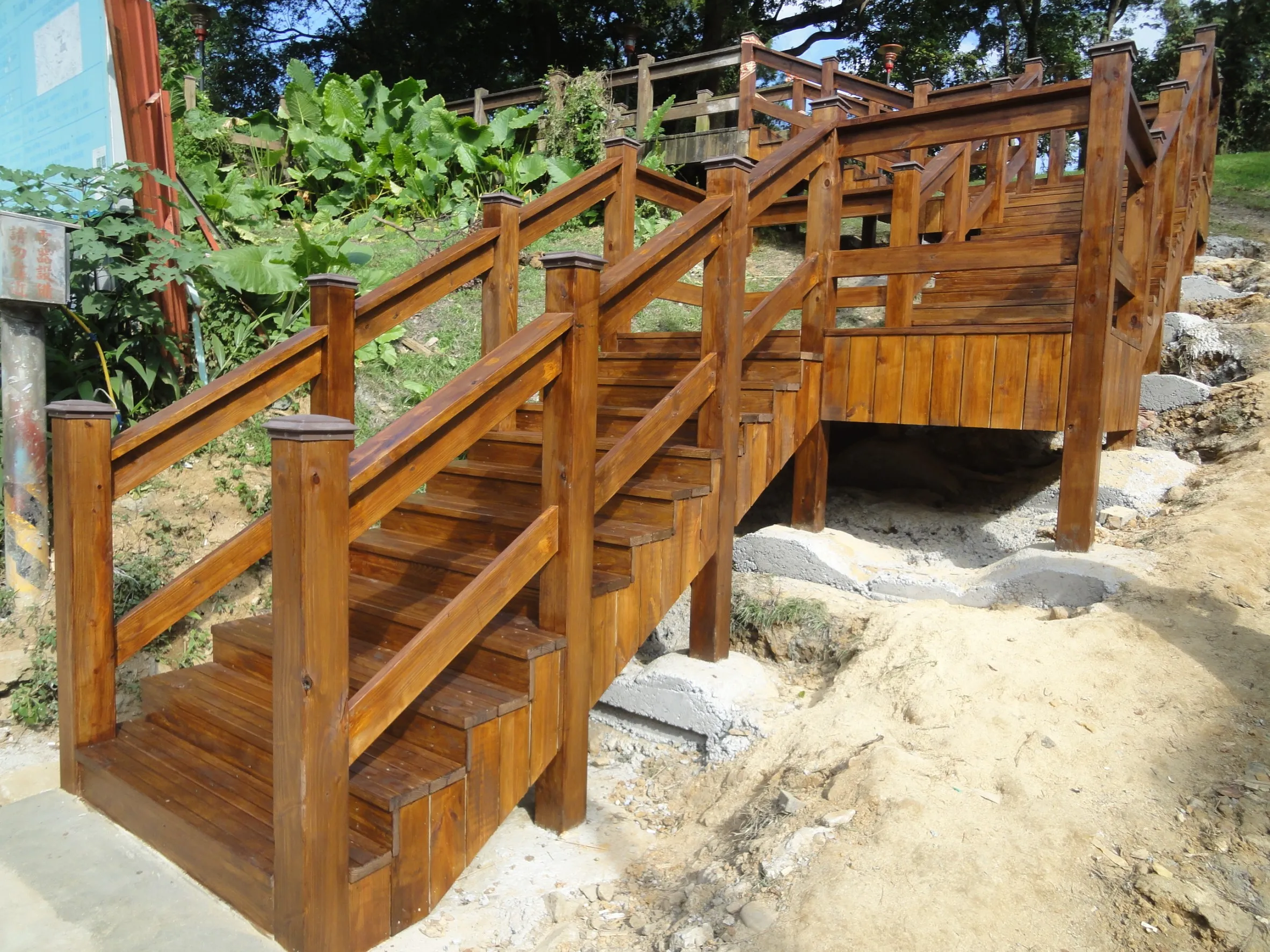 大清水公園入口階梯和欄杆,材質為南方松,長期面對日照,需具抗紫外線、防水、防潮才能使建物更耐久。