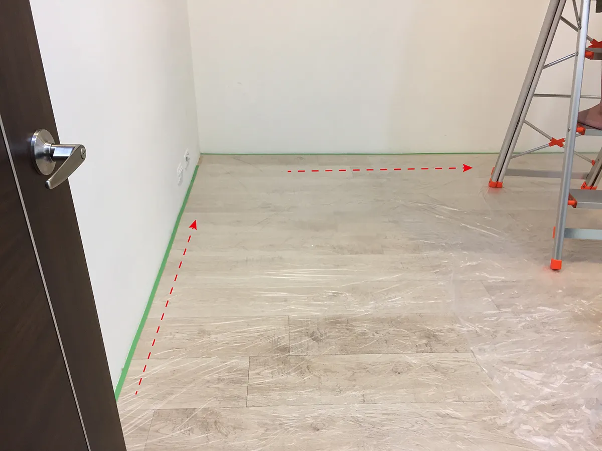 在地板上、周圍物件先貼上養生膠帶保護,避免塗料滴落、染色。